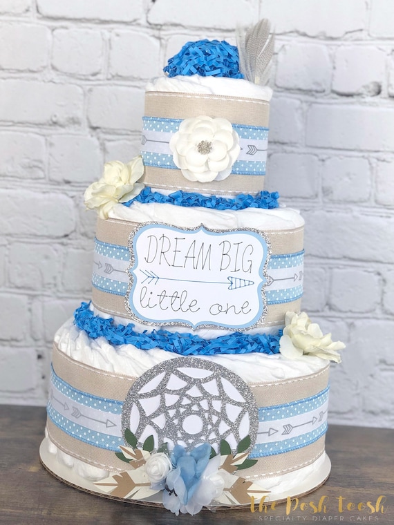 Dreamcatcher Diaper Cake Centerpiece Dream Big Little One Boho Rustic Tribal Blue Gray Silver Floral Feathers Baby Shower Decor 3 Tier