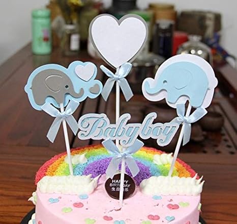 Purearte Cute Baby Shower Cake Topper For Baby Boy Party Favors Decoration Blue White Elephant And Heart With Bow
