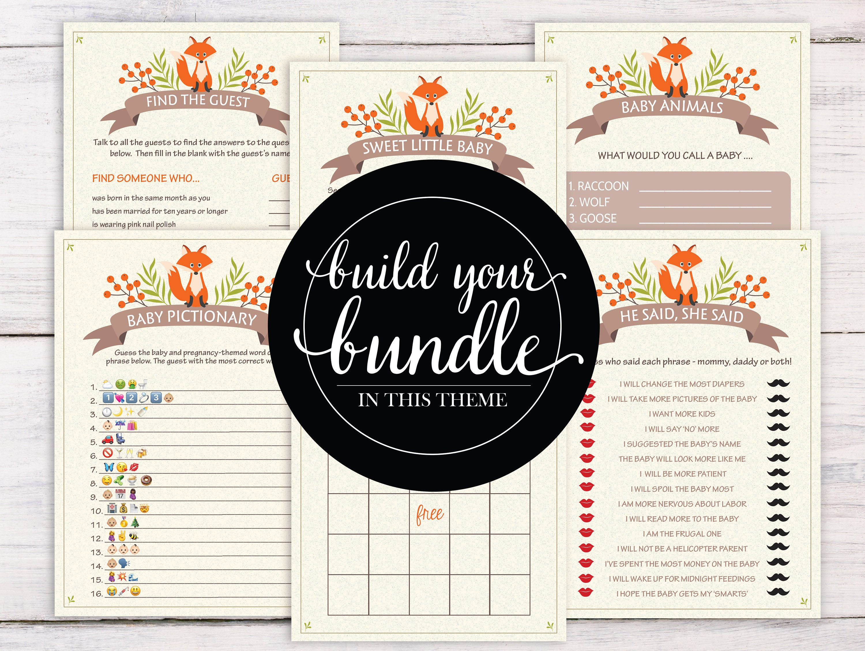 Choose 6 Games Baby Shower Games Woodland Baby Shower Baby Shower Ideas Gender Neutral Bingo He Said She Said Baby Animals 0006 N