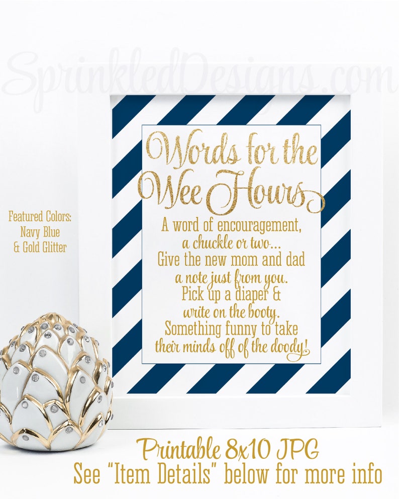 Baby Shower Games Words For The Wee Hours Words Of Wisdom Late Night Diapers Navy Blue Gold Glitter Printable Baby Boy Shower Game Ideas