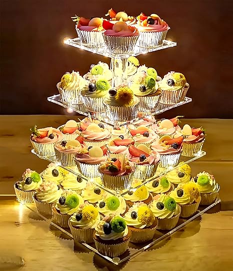 Hexnub 4 Tier Acrylic Cupcake Stand Light Up Cake And Dessert Square Display Serving Tower With Led Lights For Wedding Party Birthday Baby Shower