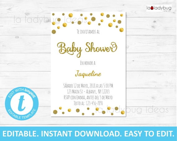 Editable Baby Shower Invitation English And Spanish Version Instant Download Easy To Edit Gold And White Baby Shower Editable Invitation
